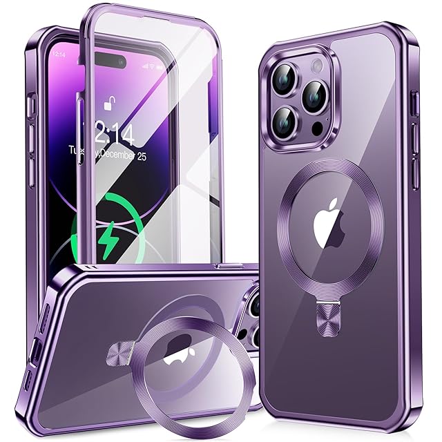 【360°全面保護・スタンド・Magsafe対応】KELLCASE iPhone 14 Pro Max 用 ケース 両面 隠しスタンド・CDリング 横縦両立 ワイヤレス充電 いphone14 promax カバー 黄変防止透明PC背面 メッキバンパー 米軍MIL規格耐衝撃 マグセーフ対応 高感度タッチ ストラップホール付き アイフォン14プロマックス 用 ケース 6.7インチ(ディープパープル)