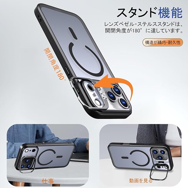 【高品質素材·ワイヤレス充電対応】高品質PC+TPU素材を採用し、外部からの衝撃をしっかりと吸収します。柔軟性のため、着脱も容易にできます。スマートフォンを日常生活で傷から守る。一体型のデザインで、いつでもスタンドを使うことができ、利便性が大幅に向上!ケーススタンド内部に360度全周一体の高性能磁石を埋め込み、ワイヤレス充電に対応しています。