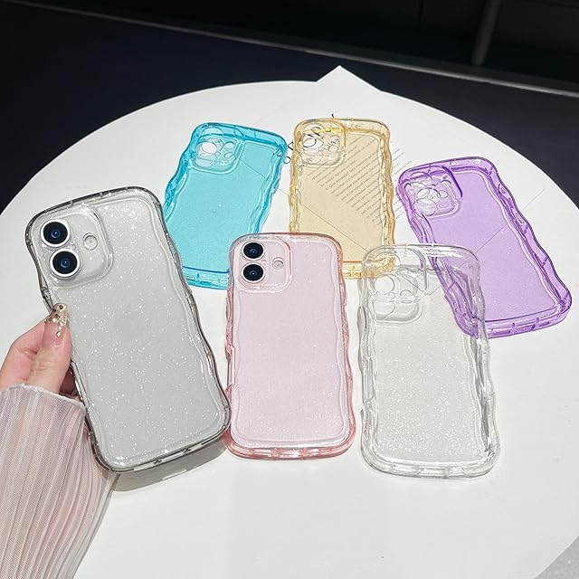 ZTOFERA for iPhone 17 ケース,女性女の子男性用クリアグリッターカーリーウェーブフレーム,iPhone 17用かわいいスマホケース,ブルー