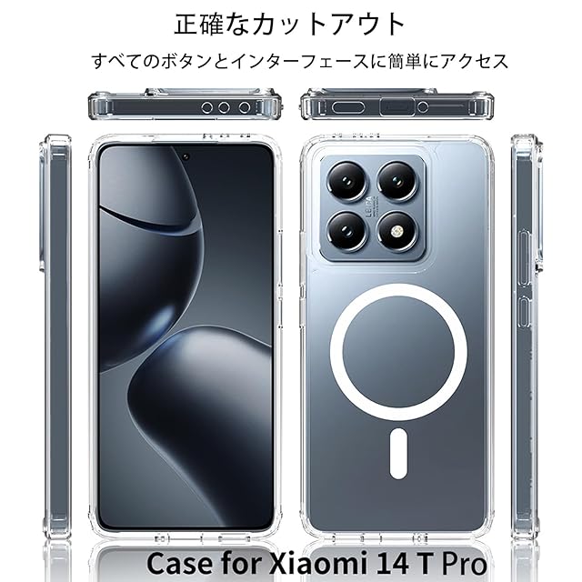 <b>Xiaomi 14T Pro 用 ケース クリア 耐衝撃<br> xiaomi 14t pro ケース 透明<br> Xiaomi 14T Pro ケース 薄型<p> ※親切なヒント:<br> 1. 必ず対応モデル名を確認してください。<br> 2. 製品の裏面に保護フィルムが貼ってあるため、気泡が入る場合がございますが、ご使用前に保護フィルムを剥がしてください。<p> 四隅に落下防止エアバッグを内蔵した設計:<br> バンパーは衝撃吸収に優れたソフトTPU素材、コーナーにエアバック設計で落下などによる衝撃からxiaomi 14 t pro 本体を保護します。<p> カメラレンズ保護: <br> カメラやフラッシュの性能を損なわない形状です。突き出たカメラレンズを保護できる厚みも。<p> 疎油層テクノロジー:<br> 耐油・防汚・洗える・ひと拭きできれいに。<br> バックは衝撃分散に優れたポリカーボネート素材、内側には本体とケースが張付くグレア現象防止にマイクロドット加工され、美しさを保ちます。<p> Magsafe対応:<br> xiaomi 14t pro ケースには38個の特殊磁石が内蔵されており。MagSafe関連アクセサリをしっかり吸着可能。<br> Qiワイヤレス充電対応、MagSafeウォレット、カードホルダー、スタンド、カーマウントなどに対応。</b>