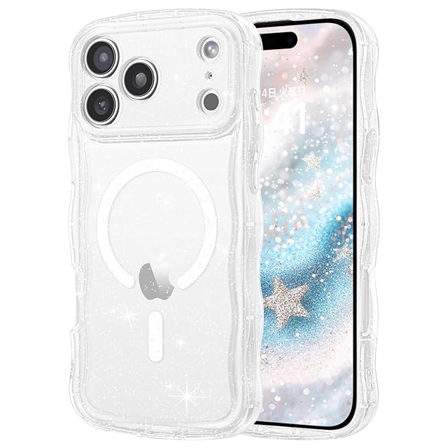 商品名:VENINGO いPhone 17 Proケース Magsafe対応 ウェーブ グリッター かわいい 韓国 透明 ストラップホール付き ワイヤレス充電対応 耐衝撃 可愛 おしゃれ 黄変防止 全面保護 スマホケース アイフォン17 Proカバー 6.3インチ キラキラ クリア