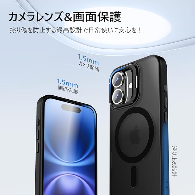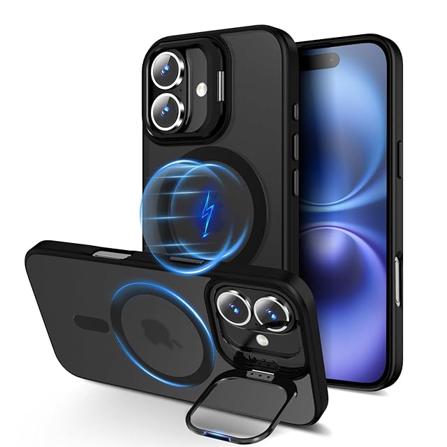 iphone 16 用 ケース レンズスタンド付き iphone 16 ケース Magsafe対応 隠れスタンド アイフォン 16 カバー 米軍MIL規格 耐衝撃 スマホケース アイフォン 16 軽量 いphone16 カバー マグネット内蔵 防指紋 半透明 マット 黄変防止 6.1インチ ブラック 【SHANGHAO】