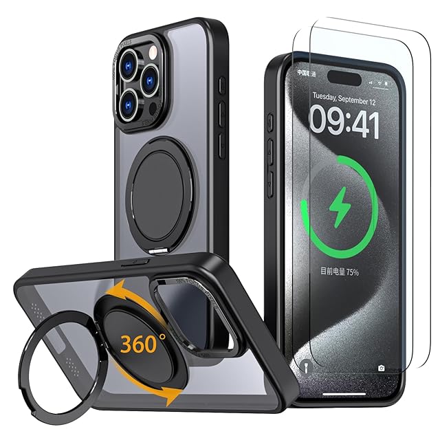 【強化フィルム2枚付き】HCXLYP iPhone 14 Pro ケース Magsafe対応 スタンド付き マグネット搭載 ワイヤレス充電 耐衝撃 マット感 半透明 指紋防止 アジャスタブルスタンド アイフォン14プロ カバー ブラック