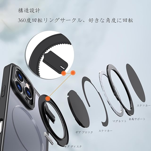 【捻れば最適な角度】精密な機械工学により、捻るたびに機械式腕時計の巻き上げのようなカチッとした音と感触を生む。角度安定。仕事中は情報確認やビデオ会議、通勤時の情報チェック可。リングとしても使用可。"プライベート"は息抜きではなく、視野を変える時。映像やゲーム、写真やSNSチェック、家族との連絡など、多彩なシーンで活躍!(iphone 14 pro ケース)