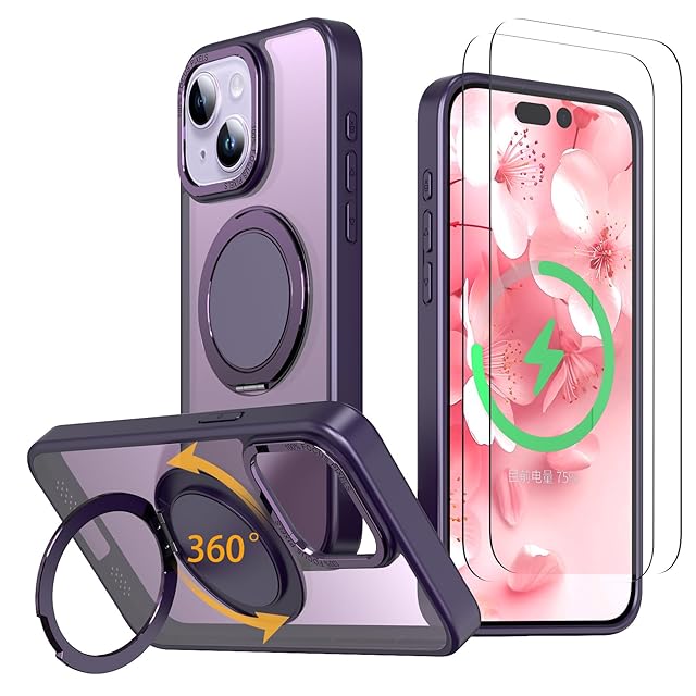 【強化フィルム2枚付き】HCXLYP iPhone 15 ケース Magsafe対応 スタンド付き マグネット搭載 ワイヤレス充電 耐衝撃 マット感 半透明 指紋防止 アジャスタブルスタンド アイフォン15 カバー 濃い紫色