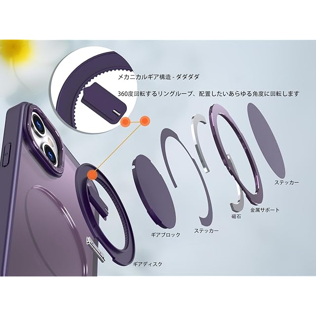 【捻れば最適な角度】精密な機械工学により、捻るたびに機械式腕時計の巻き上げのようなカチッとした音と感触を生む。角度安定。仕事中は情報確認やビデオ会議、通勤時の情報チェック可。リングとしても使用可。"プライベート"は息抜きではなく、視野を変える時。映像やゲーム、写真やSNSチェック、家族との連絡など、多彩なシーンで活躍!(iphone 15 ケース)