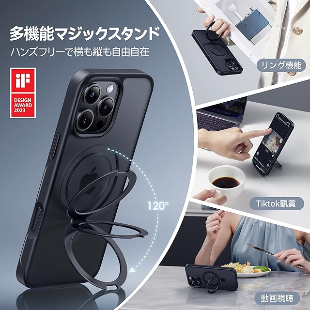【スゴすぎる!多機能スタンド】MagicStandシリーズは、縦横どちらの向きでも使えるスタンド機能に加え、リング機能とMagSafe充電対応を搭載。品質・機能性・デザインのすべてを高水準で実現し、シーンや性別を問わず使える洗練された便利なケースです。スタンド機能は、画面を見やすい角度で固定でき、動画視聴やビデオ通話がより快適になります。また、高品質な素材と特許技術を採用し、30,000回の開閉テストをクリア。リング部分の緩みを防ぎ、従来品の約10倍の耐久性を実現しました。さらに、素材・形状・加工に徹底的にこだわり、スマホの操作性を向上。どんなシーンでもストレスなく快適に使えるケースに仕上げました。