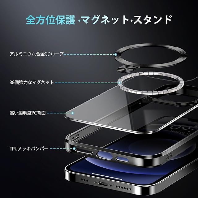 【CDパターン磁石リング・NEO永久磁石技術】 CD レコードの質感からインスピレーションを得たこのデザインはアルミニウム合金製で、iPhone 12ケースのMagsafe リングと統合されています。CDパターンの質感の金属光沢とシェルの電気メッキフレームは非常に高級感があり、あなたのiPhone 12をユニークにします。このアイフォン 12ケースの隠しスタンド内部に「NEO永久磁石技術」配列永久磁石を使用し、iPhoneと同じタイプの輸入高コスト磁石コア、iPhone 12磁石充電により適しています。磁力は通常ケースの8倍以上!通常の磁石に比べ4~5倍のエネルギー変換があり、充電効率が大幅に向上します。このアイホン12ケースは全てのMagSafe対応アクセサリーに対応しているので、快適なスマホライフを共に過ごしましょう!
