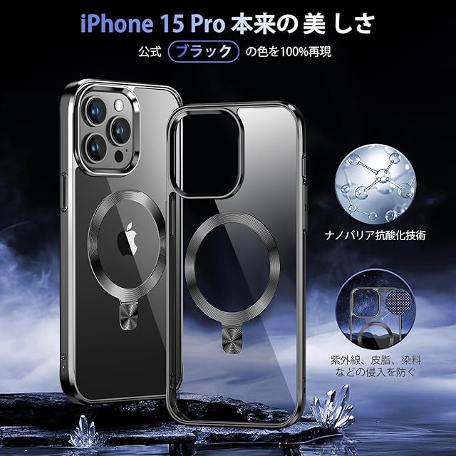 【CD MagSafeリング・スタンド一体】iPhone 15 Pro 用クリアケース[MagSafe対応・隠しスタンド] [本体の色・メッキバンパー]ストラップホール付き 角度調整可 米軍MIL規格取得・耐衝撃 アイホン15 Pro透明ケース スマホケース15プロ人気6.1インチ(ブラック)