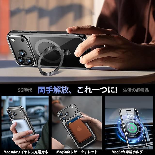 商品名:【CD MagSafeリング・スタンド一体】iPhone 17 Pro 用クリアケース[MagSafe対応・隠しスタンド] [本体の色・メッキバンパー]ストラップホール付き 角度調整可 米軍MIL規格取得・耐衝撃 アイホン17 Pro透明ケース スマホケース17プロ人気6.3インチ(ブラック)