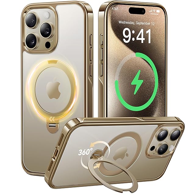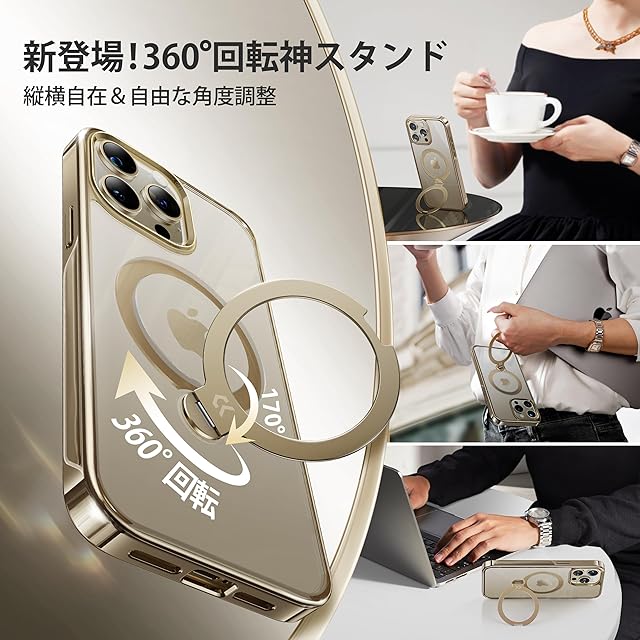 【透き通る上質感・定点360°回転】CASEKOO iPhone 15 Pro Max 用ケース クリア 米軍MIL規格 フィット感 MagSafe対応 ワイヤレス充電 横縦両立 角度自在 超強磁力 耐衝撃 高耐久性 ラップホール付き 透明 黄変防止 いphone15pro max 用ケース「MagicStand Pro Kosai」(ゴールド)
