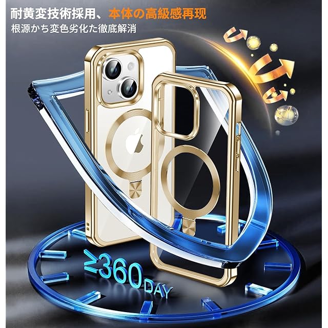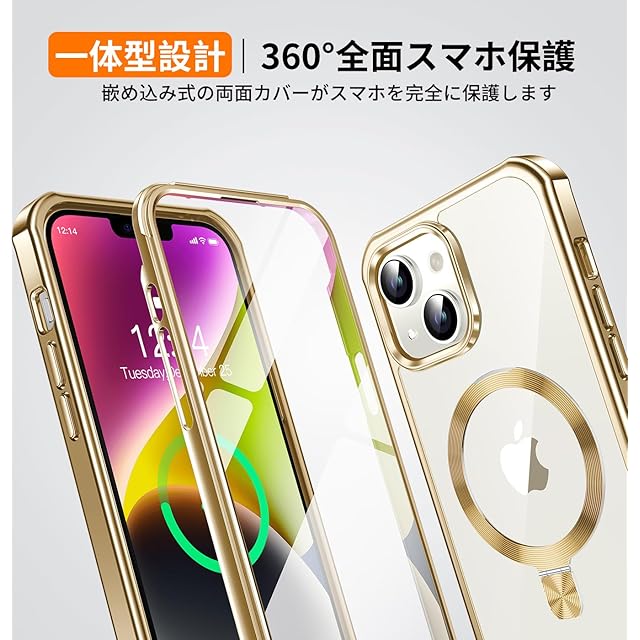 商品名:【360°全面保護・スタンド・Magsafe対応】KELLCASE iPhone 14 用 ケース 両面 隠しスタンド・CDリング 横縦両立 ワイヤレス充電 いphone14 カバー 黄変防止透明PC背面 メッキバンパー 米軍MIL規格耐衝撃 マグセーフ対応 高感度タッチ ストラップホール付き アイフォン14 用 ケース 6.1インチ(ゴールド)