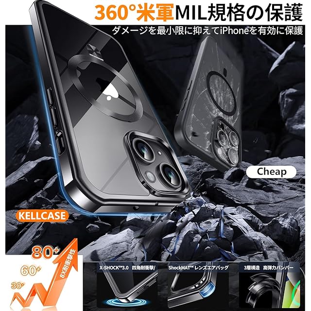 商品名:【360°全面保護・スタンド・Magsafe対応】KELLCASE iPhone 14 用 ケース 両面 隠しスタンド・CDリング 横縦両立 ワイヤレス充電 いphone14 カバー 黄変防止透明PC背面 メッキバンパー 米軍MIL規格耐衝撃 マグセーフ対応 高感度タッチ ストラップホール付き アイフォン14 用 ケース 6.1インチ(ブラック)