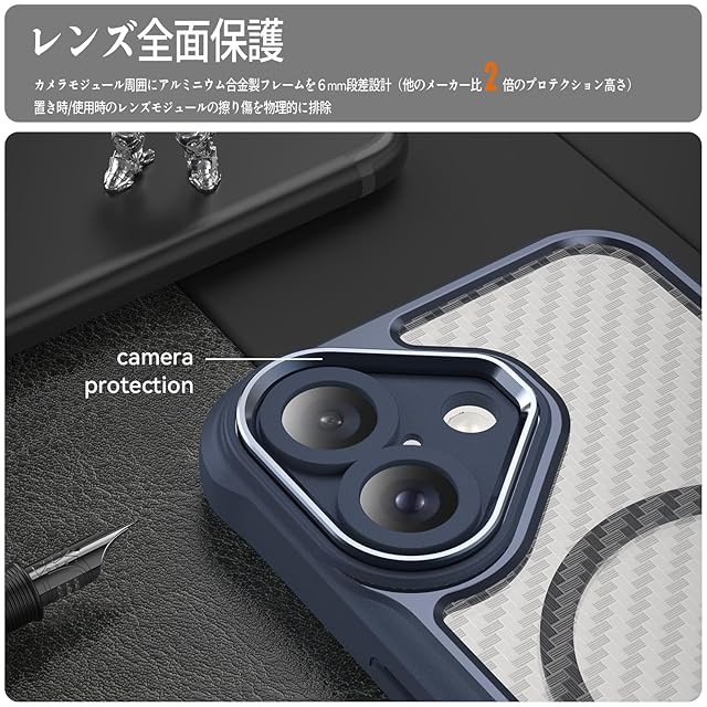 【設計】本製品は背面に高級感あふれるカーボン調テクスチャーと黄変防止コーティングを採用し、スピーカー部分に防塵設計を採用し、ホコリの侵入をブロックします。半透明バックパネルのマット質感は、iPhone本来の美しさを再現しながらも神秘感に溢れています。全カラーのiPhoneに調和するスタイリッシュなデザインで、ストラップホール付きで携帯性も抜群。
