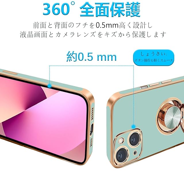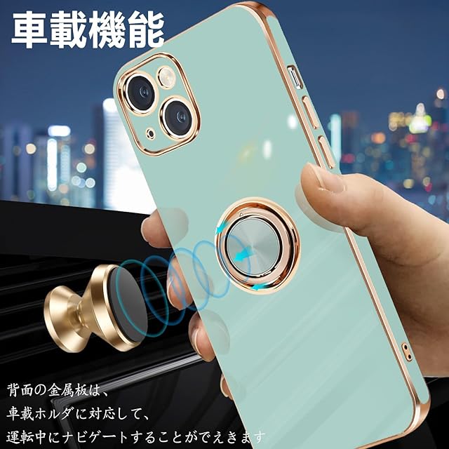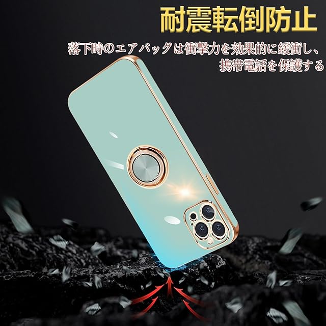 MiaoKeDa iPhone 14 ケース リング 耐衝撃 いphone14 リング付き スマホケース TPU 車載ホルダー ストラップホール付き メッキ加工 カバー ライトシアン