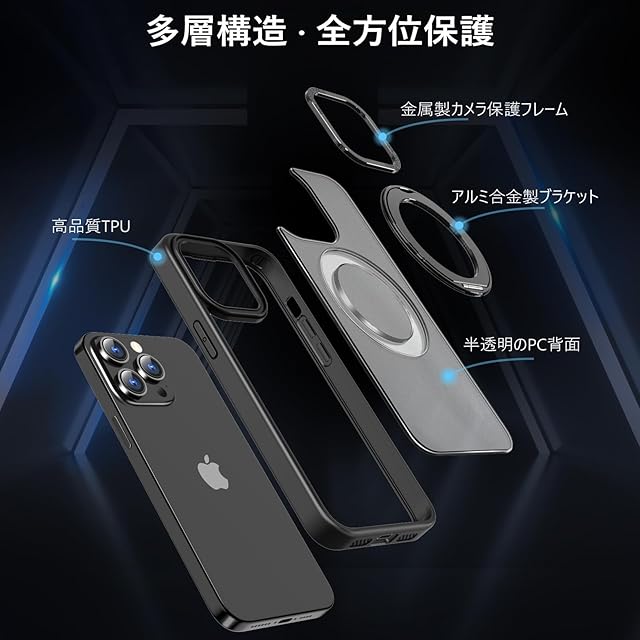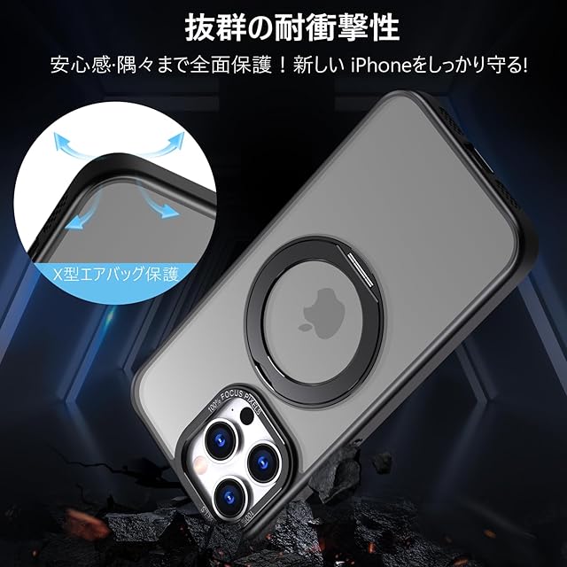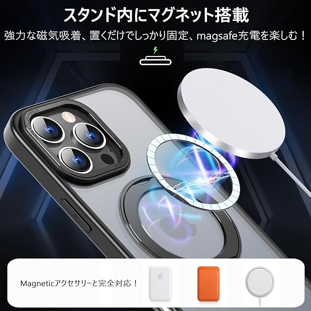 商品名:KWATUNG 互換品 iphone 14 pro max 用 ケース magsafe対応 ワイヤレス充電 iphone14promax 用スマホケース 耐衝撃 いphone14pro max 用ケース 360°回転スタンド 縦横両対応 iphone14プロマックス用スマホケース マグネット搭載 米軍MIL規格 アイフォン14プロマックス用カバー 6.7インチ 半透明 マット感 ブラック