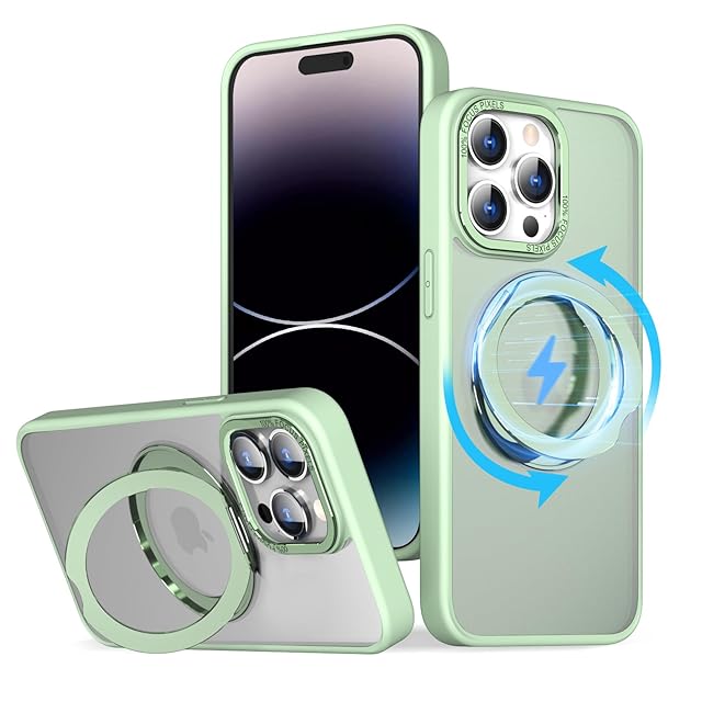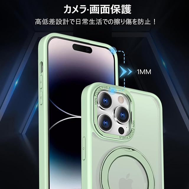 KWATUNG 代替品 iphone 14 pro 用 ケース magsafe対応 ワイヤレス充電 耐衝撃 いphone14pro 用ケース magsafe対応 360°回転スタンド 縦横両対応 アイフォン14pro 用カバー マグネット搭載 iphone14プロ 用スマホケース 米軍MIL規格 スマホケース iphone 14 pro用 6.1インチ マット感 ライトグリーン