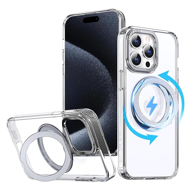KWATUNG 互換品 iphone 15 pro max 用 ケース magsafe対応 ワイヤレス充電 アイホン15pro max 用スマホケース 落下防止 耐衝撃 いphone15pro max 用 ケース 360°回転スタンド 縦横両対応 iphone15プロマックス 用カバー マグネット搭載 防指紋 米軍MIL規格 6.7インチ 透明 クリア