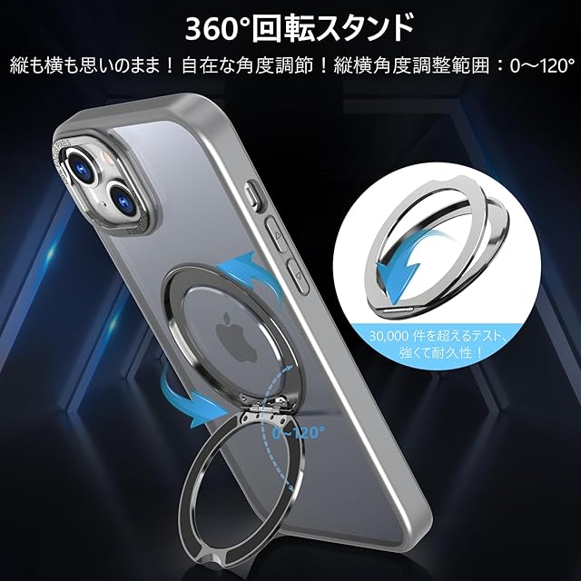 KWATUNG 互換品 iphone15用ケース magsafe対応 ワイヤレス充電 あいふおん 15 用 ケース 耐衝撃 いphone15 用 カバー 360°回転スタンド 縦横両対応 スマホケース iphone 15 用 マグセーフ リング マグネット搭載 アイフォン15 用スマホケース 防指紋 米軍MIL規格 6.1インチ 半透明 マット感 チタングレー