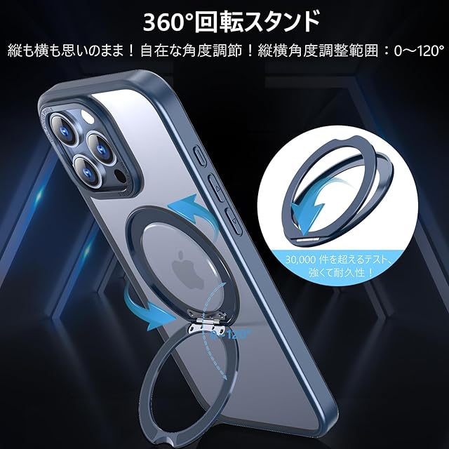 商品名:KWATUNG iphone 16 pro max 用 ケース magsafe対応 ワイヤレス充電 アイホン16pro max 用スマホケース 落下防止 耐衝撃 いphone16pro max 用 ケース 360°回転スタンド 縦横両対応 iphone16プロマックス 用スマホケース マグネット搭載 防指紋 米軍MIL規格 6.9インチ 半透明 マット感 ブルー