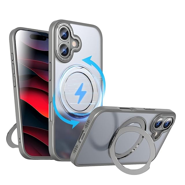 KWATUNG iphone17用ケース magsafe対応 ワイヤレス充電 あいふおん17 用 ケース 耐衝撃 360°回転スタンド 縦横両対応 スマホケース iphone 17 用 マグセーフ リング マグネット搭載 アイフォン17 用スマホケース 防指紋 米軍MIL規格 いphone17 用カバー 6.3インチ 半透明 マット感 チタングレー(GRAY)