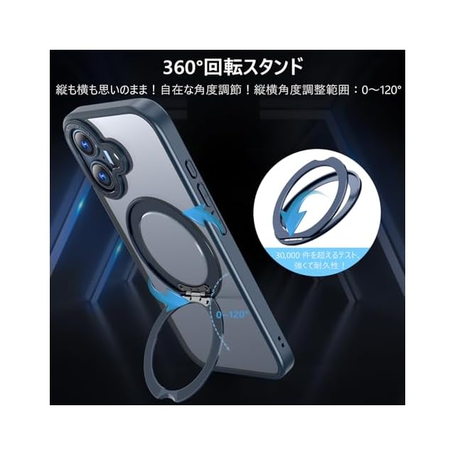 【360°回転スタンド · 縦も横も思いのまま】多機能スタンドとリング一体型の斬新なデザインです。ケースを閉じれば背面はスマートに平坦に。縦置きでも横置きでも安定して支えられ、0°~ 120°の間で多角度自由に調整できます。ケースを開けるだけでスタンドの完成!指にかければリングも便利に使用でき!また、安定したアルミ合金製の円形スタンドを採用しており、携帯性からもファッション性からも唯一無二の存在です。