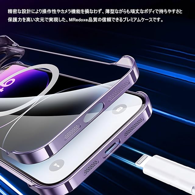 【超薄型フレームレス・上質なPC素材】、【一体型カメラレンズ保護】、【極々透明感】、【MagSafe対応+ストラップホール】、【美しいデザイン】