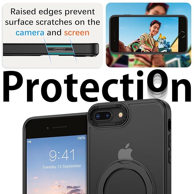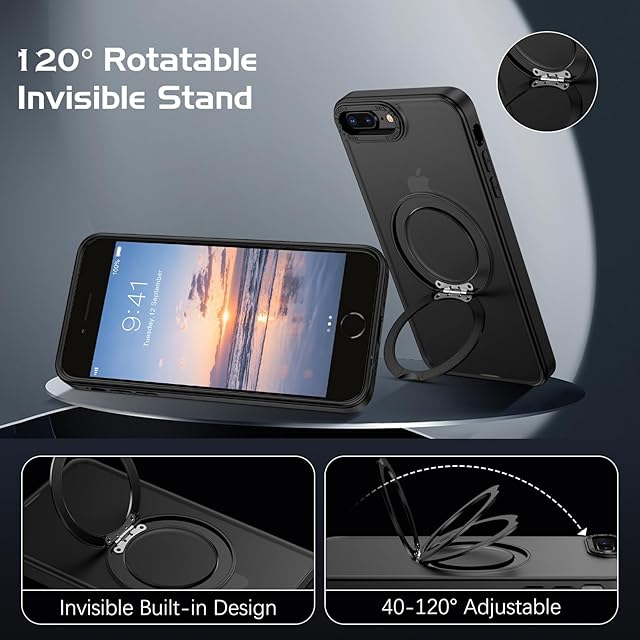 DOMAVER iPhone 8 Plus ケース iPhone 7 Plus ケース Magsafe対応 360°回転スタンド ワイヤレス対応 半透明 傷に強い背面 滑り止め 黄ばみなし ストラップホール付き 画面レンズ保護 指紋防止 耐衝撃 いPhone 8 Plus スマホカバー アイフォン 7 Plus 用カバー 5.5インチ ブラック