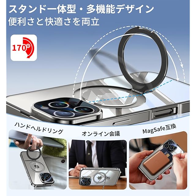 【3in1超進化スタンド・驚異の実用性!】当店のiphone16pro 携帯ケースは、スタンド・リング・ワイヤレス充電対応の3機能を一つに集約。30000回以上の開閉テストをクリアした耐久性に加え、指紋やキズにも強い高耐久設計を実現しています。通勤中の語学学習、リモートワークでのビデオ会議、キッチンでのレシピ確認、アウトドアでの自撮りなど、あらゆるシーンで驚くべき実用性を発揮します。リングモードでは、指を引っ掛けるだけで安定保持が可能。満員電車の中でも落下の心配がなく、安心してお使いいただけます。さらに、このアイホン16 pro ケースは、業界最強クラスのN56マグネットを採用(従来比20倍の吸着力)。マグセーフ対応の車載ホルダーに装着すれば、悪路でもしっかり固定され、快適なドライブをお楽しみください