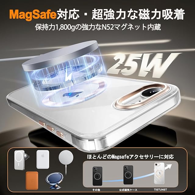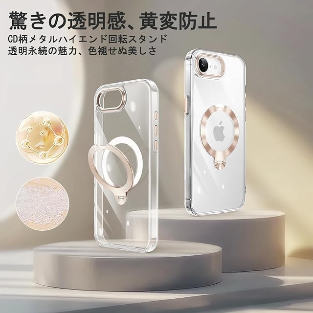 商品名:TISTUNST iPhone 16e 用 ケース 透明 CDリング 【多機能 360°回転スタンド】【横縦両立・角度自由調整】搭載MagSafe対応 ワイヤレス充電対応 米軍MIL規格 耐衝撃 防指紋 黄変防止 レンズ保護 両眼 いphone16e 用 ケース 6.1インチ (ゴールド)
