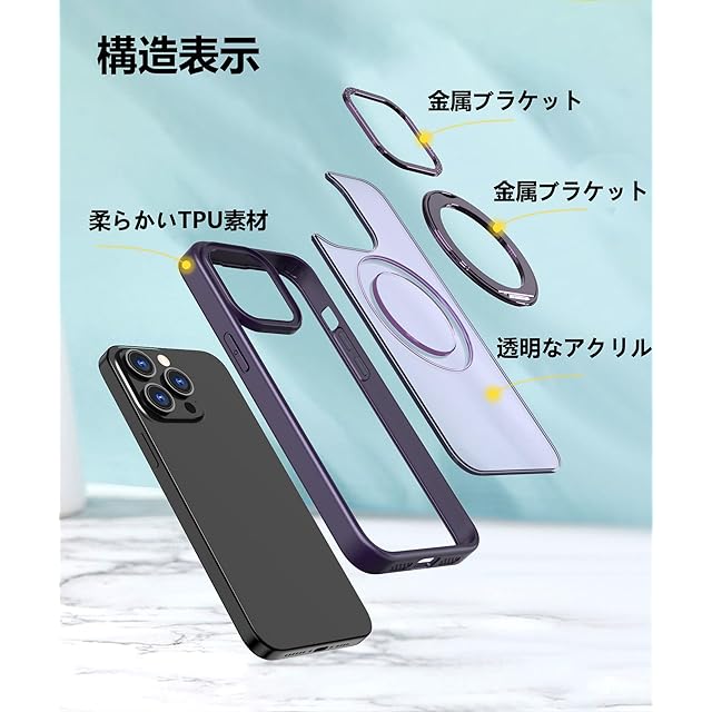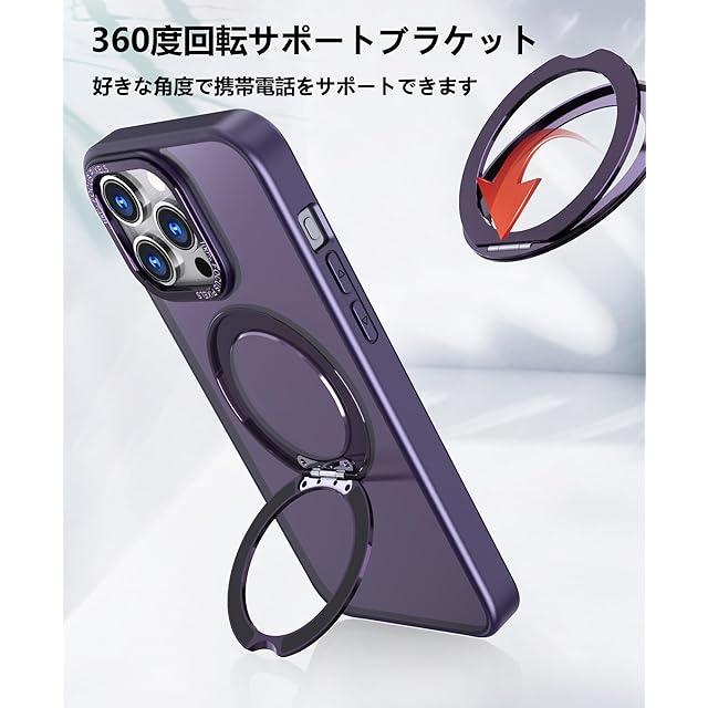 商品名:【強化フィルム2枚付き】HCXLYP iPhone 14 Pro Max ケース MagSafe対応 リング スタンド 多機能 360度回転 縦横両対応 いphone14promax カバー ワイヤレス充電対応 スマホケース 14promax携帯ケース 米軍MIL規格 耐衝撃 N52マグネット 半透明 マット感 濃い紫色
