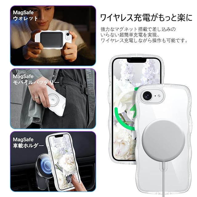 商品名:GUAGUA iphone 16e ケース 360°回転スタンド あいふおん16e マグセーフ ウェーブケース うねうね 人気 耐衝撃 おしゃれ 黄ばみなし ワイヤレス充電 スマホケース 16e 米軍規格 耐衝撃 リング マグネット ストラップホール付き なみなみ カバー(クリア)