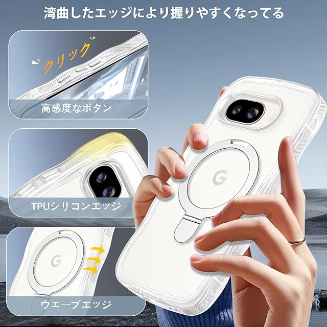商品名:GUAGUA Google Pixel 9A ケース クリア ウェーブ ピクセル Magsafe対応 ワイヤレス充電 回転スタンド 9a ソフト うねうね 純透明 マツと感 人気 韓国 耐衝撃 超軽量 薄型 おしゃれ 黄ばみなし アクスタが入る スマホケース 9a 米軍規格 耐衝撃 マグセーフ リング マグネット搭載 ストラップホール付き グーグルピクセル9a なみなみ カバー