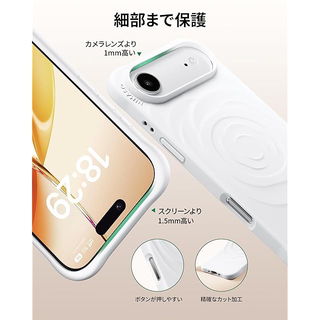 【全面保護】ケースのコーナーには強化クッションを採用し、スマホの画面より1.5mm、カメラレンズ部分より1mm高くするこで、落下時の衝撃から端末を守ります。内部には超細繊維の毛生地を採用し、スマホ背面との接触面を保護し、微細な塵や砂粒によるキズを防ぎます。また、アイフォンエアーケース外側には耐摩耗コーティングを施し、長期間使用してもデザインが剥がれにくい仕様となっております。
