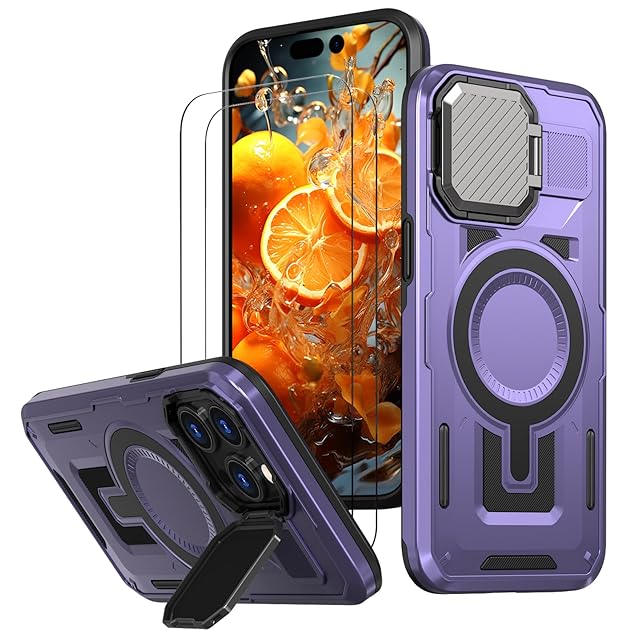 【強化フィルム2枚付き】HCXLYP iPhone 14 Pro Max ケース MagSafe対応 隠れスタンド レンズ保護 いphone14promax ケース ワイヤレス充電対応 スマホケース アイホン14promax 携帯ケース 耐衝撃 傷防止 全面保護 米軍MIL規格 濃い紫色