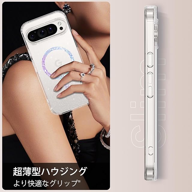 【キラキラ輝く・クリアデザイン】 透明な TPU+PC 素材に キラキラ粒子を封入して、Google Pixel 10 Pro XL の本体色を最大限に活かしつつ、女性らしい華やかさ を追加します。光の角度で変化する キラキラ効果 が、普段使いも特別な日に持ちたい かわいいスマホケースに変身します。黄ばみ防止加工 で長期使用も透明美持続します。