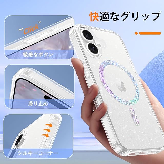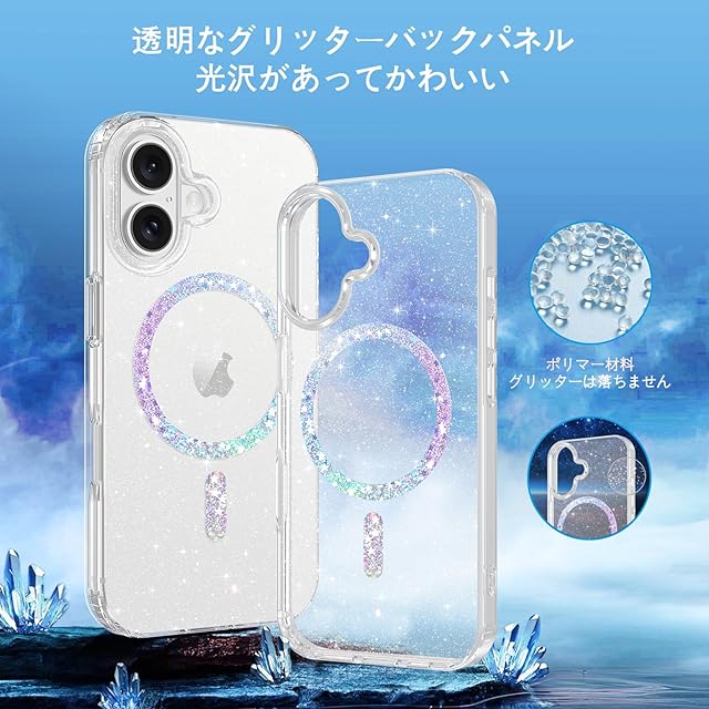 YINLAI iPhone 16 用 ケース クリアは、美しいグリッターで飾られたユニークな透明なデザインで、絶妙で美しいです。 あなたのiPhone 16を特別な状態に保ち、日常生活で目立つことができ、あなたの高度な美学を示すことができます。<br> YINLAI iPhone 16 用 ケース 耐衝撃は高品質の素材を使用し、ミリタリーグレードを超えるレベルの保護性能を iPhone 16に提供し、衝撃を受けたり、傷がつくのを効果的に防ぎます。 新しい抗黄変技術の画期的な進歩により、製品は長期間透明なままで輝き続け、美しさは決して衰えません。<br> iPhone 16 用 ケース マグネット式は厚さ1.0mmのN52マグネットが38個内蔵されており、通常のケースの2倍の強度があります。ケースを取り外すことなく自動的にMagSafe充電器と整列するので、真の充電スピードを体験できます。また、すべてのMagSafeアクセサリーと互換性があります。