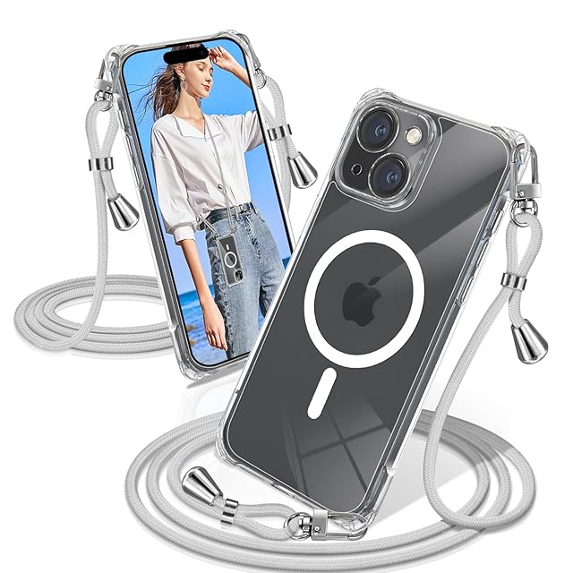 商品名:iPhone 15 ケース クリア ショルダー MagSafe対応 耐衝撃 iPhone15 スマホケース マグセーフ対応 透明 織りストラップ付き アイフォン15 カバー 肩がけ 首掛け 紐付き 縄掛け シングルショルダーロープ 斜めがけ 調節可能なショルダー クロスボディ 多目的キャリー ファッションデザイン TPUスマホ(グレー)
