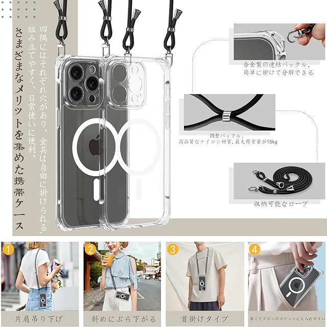 商品名:iPhone 15 Pro Max ケース クリア ショルダー MagSafe対応 耐衝撃 iPhone15ProMax スマホケース マグセーフ対応 透明 織りストラップ付き アイフォン15 Pro Max カバー 肩がけ 首掛け 紐付き 縄掛け シングルショルダーロープ 斜めがけ 調節可能なショルダー クロスボディ 多目的キャリー ファッションデザイン TPUスマホ(ブラック)