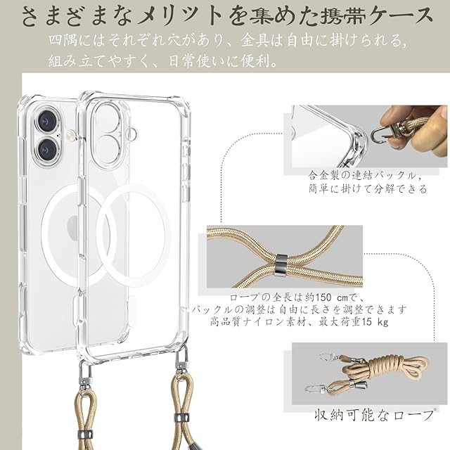 商品名:iPhone 16 Plus 用 ケース クリア ショルダー MagSafe対応 耐衝撃 iPhone16Plus スマホケース マグセーフ対応 透明 織りストラップ付き アイフォン16 Plusカバー 肩がけ 首掛け 紐付き 縄掛け シングルショルダーロープ 斜めがけ 調節可能なショルダー クロスボディ 多目的キャリー ファッションデザイン TPUスマホ(ゴールド)