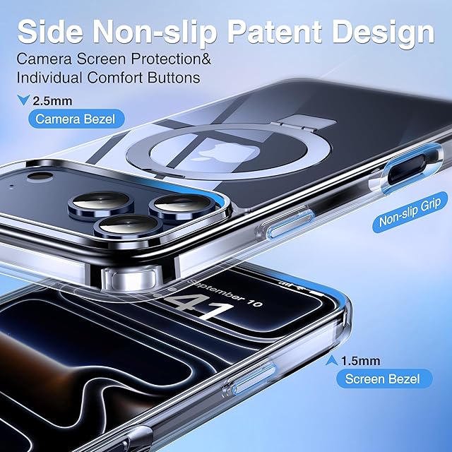 【薄い。 ライト。 滑り止め、断熱、ネバーイエロー】キックスタンド付き半透明磁気iPhone17 pro ケースは人間工学に基づいたデザインを採用しています、滑り止め性能に優れています。正確なカットアウトとスリムなデザインにより、携帯電話の機能を最大限に活用できます。ブラケットの溝の独自の深さにより、携帯電話のパーマを気にせずに、自由にポケットに入れることができます。 また、すべての素材とコーティングは、時間の経過による黄ばみを防ぐために最適化されています。