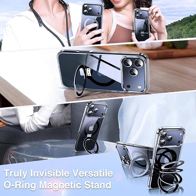 【2 in 1 磁気ケース インビジブル ホルダー】2025 新しい iPhone 17 pro 保護ケース、磁気リングとスタンド機能の両方を提供します。内蔵のアルミニウム製磁気リングは、開いたときに縦または横モードで安定して立つことができ、背面は完全に見えません。 チタン合金と無誘導減衰電話ケースホルダーは、角度を約120°反転できます。 ファイルを参照したり、ビデオを視聴したりするときはいつでも、ハンズフリーで行うことができます。