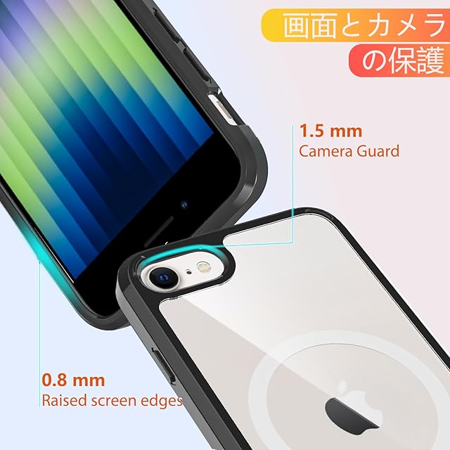【対応機種】iPhone SE (2022)、iPhone SE (2020)、iPhone 8、iPhone 7 のために専門設計。(スピーカーとカメラそして他の部位は完璧にカットアウトして、iPhone のすべての機能はケースをつけたままスムーズに操作できます)</br> 【TPU+PC組み合わせ】側面を"TPU"のソフトな素材で衝撃を吸収させ、背面は透明度が維持出来るハードな"ポリカーボネート"をハイブリッドしたこのケースは。</br> 【安心の衝撃対策】落下時の衝撃を出来る限り緩衝出来るよう、四隅で衝撃を吸収する「エアクッションテクノロジー」を採用。</br> 【透明感漂う・黄ばみ防止】背面は高透明度ポリカーボネートの素材で、アイフォン本来の崇高な美しさと高級感をそのままに映り出し、いつものスマホに上品さをプラス。また先端の黄変防止加工技術を採用、黄ばみ防止を実現、いつまでも綺麗に保ちます。</br> 【品質】:製品に不具合が生じた場合は、商品到着30日以内に、直接当店にメールにてご連絡ください。お客様からのお問い合わせ内容に応じて代替品交換・返金可能です。</br>