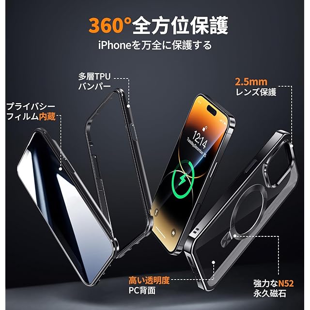 商品名:【多機能隠しスタンド・Magsafe対応・覗き見防止】WTAIYUN iPhone 14 Pro 用 ケース 全面保護 CDリング 縦横両対応 ワイヤレス充電対応 米軍MIL規格 耐衝撃 高感度タッチ 両面 いphone14プロ カバー ストラップホール付き メッキTPUバンパー PC背面 透明 黄変防止 アイフォン14pro ケース 6.1インチ(ブラック)