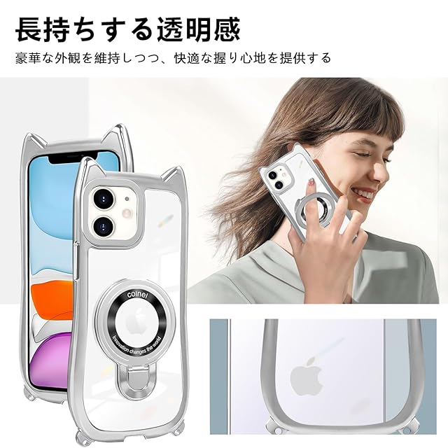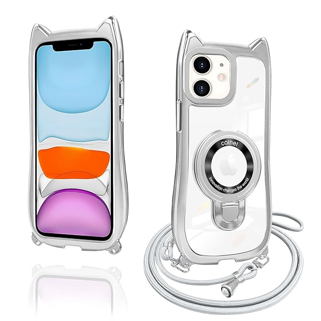 商品名:iPhone 11 ケース クリア リング付き 猫耳 ネコミミ TPU MagSafe対応 ワイヤレス充電 iphone 11 カバー 透明 アイフォン11 スマホケース ネック ショルダー 肩掛け 首掛け 斜めがけ 紐付き 長さ調整可能 韓国 かわいいファッション 耐衝撃 多機能 マグネット搭載 縦横両対応 車載対応 薄型 軽量 軍MIL規格取得 落下防止(シルバー)