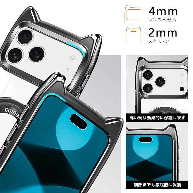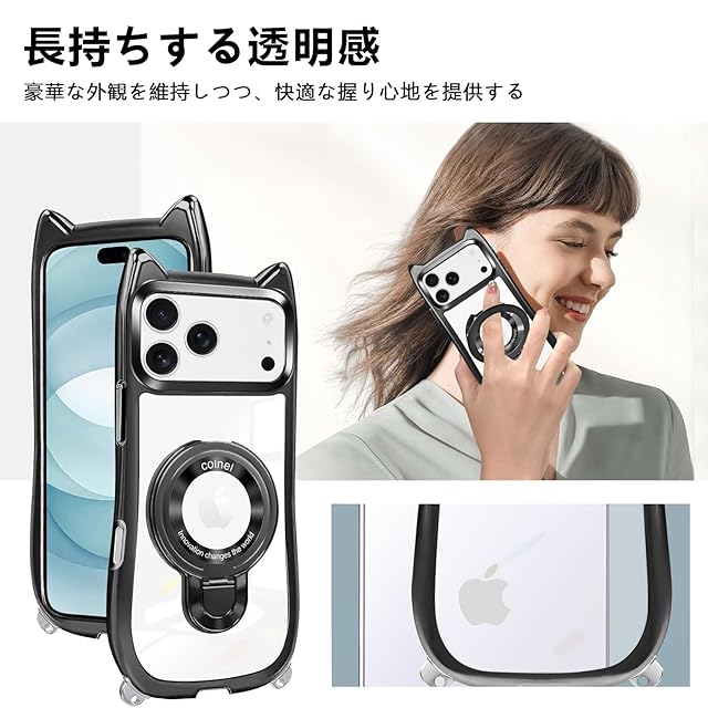 商品名:iphone 17 pro ケース クリア リング付き 猫耳 ネコミミ TPU MagSafe対応 いphone 17 proケース ワイヤレス充電 アイフォン17 proスマホケース 透明 TPU 多機能 マグネット搭載 縦横両対応 車載対応 ネック ショルダー 肩掛け 首掛け 斜めがけ 紐付き 長さ調整可能 韓国 かわいいファッション 耐衝撃 薄型 軽量 落下防止(ブラック)