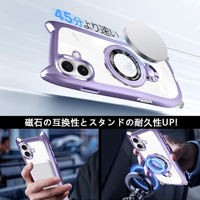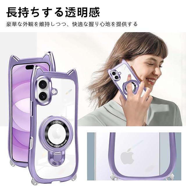 商品名:iphone 17 ケース クリア リング付き 猫耳 ネコミミ MagSafe対応 いphone 17 ケース ワイヤレス充電 アイフォン17 スマホケース 透明 TPU 多機能 マグネット搭載 縦横両対応 車載対応 ネック ショルダー 肩掛け 首掛け 斜めがけ 紐付き 長さ調整可能 韓国 かわいいファッション 耐衝撃 薄型 軽量 落下防止(パープル)