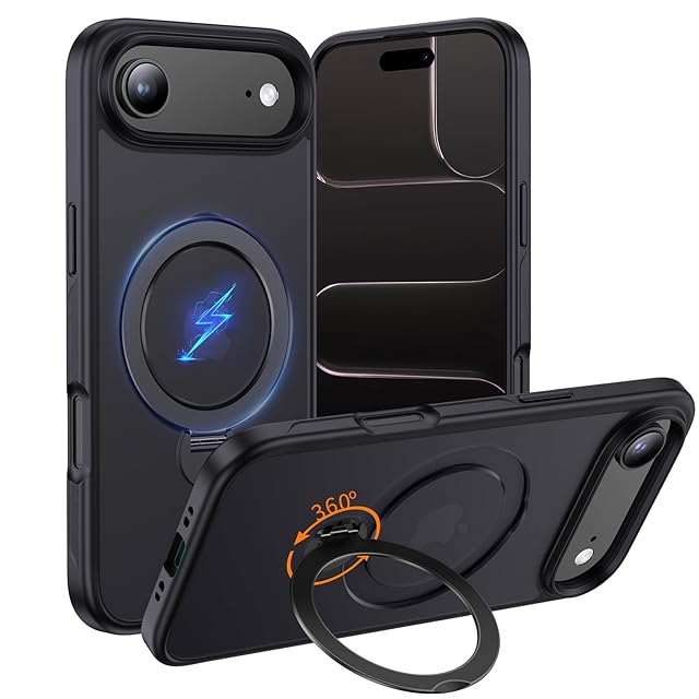 商品名:KWLZBFU いphone17air ケース MagSafe対応 【定点360度回転スタンド】 縦横両対応 半透明 マット感 マグネット搭載 黄変防止 滑り止め 耐衝撃 傷防止 iphone air ケース 6.5インチ(ブラック)