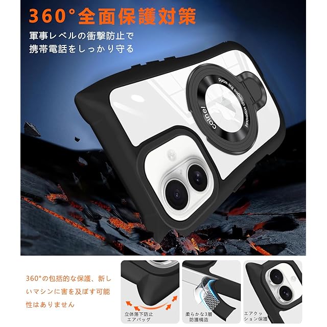 【iPhone 16 Pro Max マホケース】iPhone 16 Pro Max 専用ケース。ご確認の上ご購入ください。品質に問題がある場合は、お気軽にお問い合わせください。 【優れた素材】側面を"TPU"のソフトな素材で衝撃を吸収させ、背面は透明度が維持出来るハードな"ポリカーボネート"をハイブリッドしたケース、透明度が高く、光透過率、黄ばみに強い。 【利便性で快適】わざわざスマホスタンドを買う必要はなく、代わりになるものを探す必要もない。フラット収納できるリングはスタンドになる。縦置き、横置きのどちらでも安定的に支え、120°で多角度自由に調整でき、視聴に楽しみ、首や肩周りリラックス、指と腕の疲れ解消し, どんなことをしていても、日常生活で両手解放! 【MagSafe対応】超世代的な隠しスタンドと強力なマグネットリングの強力な結合により、高い吸着力でガッチリと固定しながら充電ができます。安定性を持ち、充電器を近づけると高速ワイヤレス充電が実現です。また、磁気を利用しているため充電器以外にもスタンドやウォレットなどのアクセサリーに固定可能。 【製品】商品到着時の初期不良や間違い等があった場合、評価前にメールでご連絡を頂けください。お客様からのお問い合わせ内容に応じて商品交換・返品可能です。