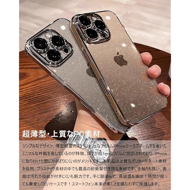 【超薄型・上質なPC素材】、【一体型カメラレンズ保護】、【高級感漂うキラキララメ+ストラップホール】、【美しいデザイン】
